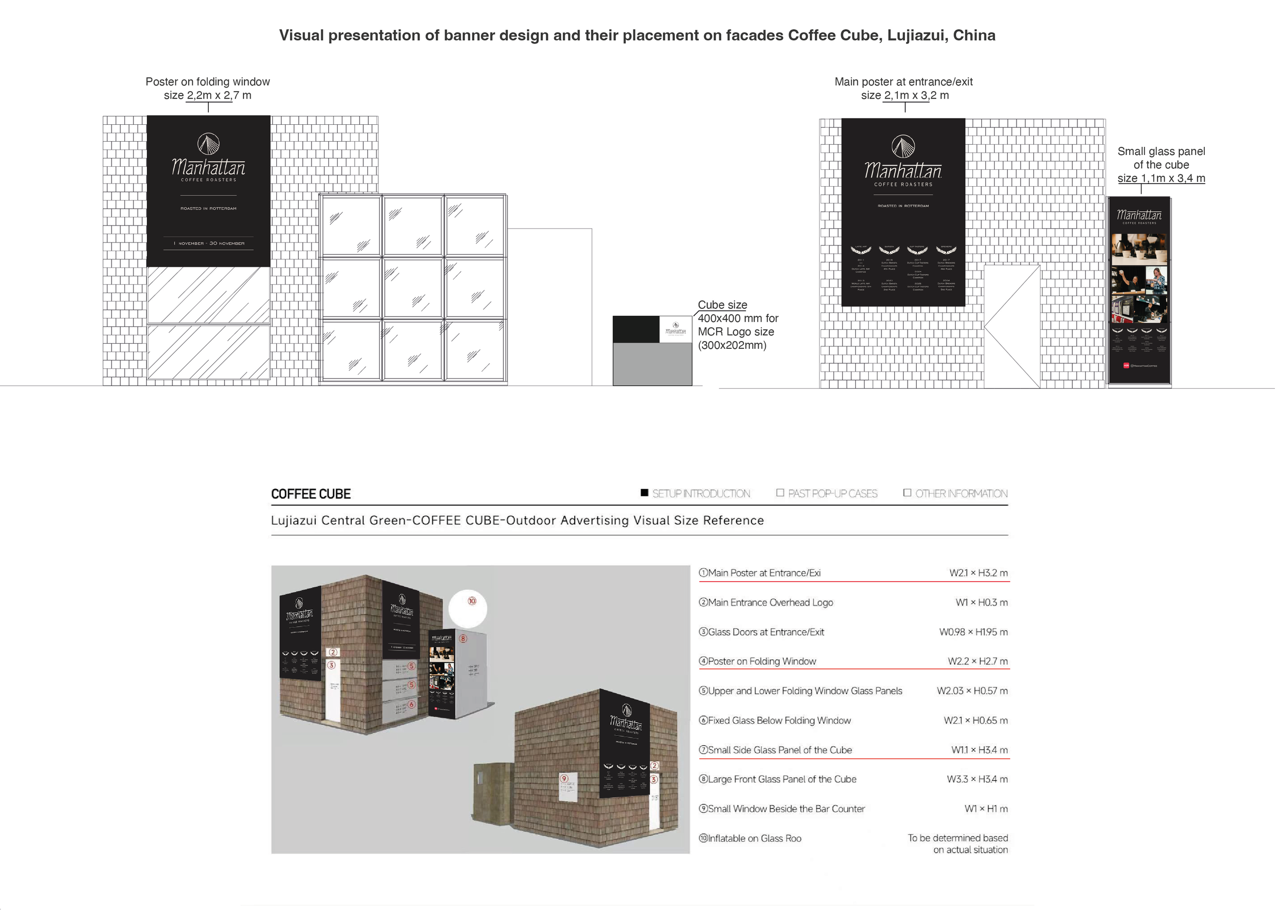 I had the opportunity to work on a promotional pop-up project for Manhattan Coffee Roasters at Coffee Cube, a unique venue located in the heart of Shanghai. In addition to the pop-up installation, I designed a range of graphic materials for the brand, including facade banners and menus.