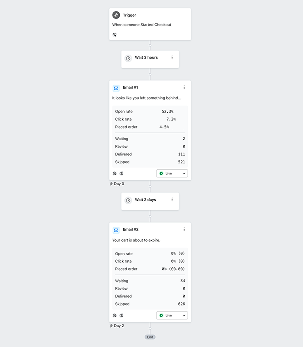 The native integration of WooCommerce has streamlined the process of managing abandoned carts, enabling the setup of an automated email flow to recover lost sales efficiently